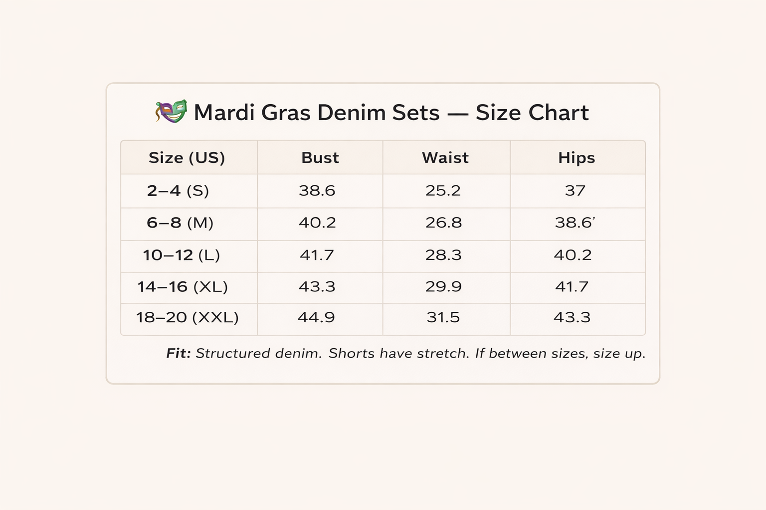 Custom denim two-piece featuring a structured jacket and stretch denim shorts. Designed with bold Mardi Gras patch for the IT girls 🥰🥰Â